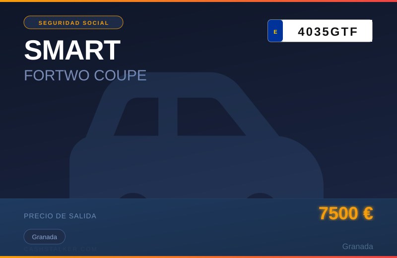 VEHÍCULO MARCA SMART, MODELO FORTWO COUPE, MATRÍCULA 4035GTF. MATRÍCULADO EL 23-07-2009, GASOLINA, ÚLTIMA ITV EL 14-12-2024 FAVORABLE CON 89.163 KM. TIENE LLAVE DE CONTACTO, NO TIENE DOCUMENTACIÓN. LE FALTA LA BATERÍA PERO ARRANCA AL PONERLE UNA. BUEN ESTADO EN GENERAL. ES PRIMERA SUBASTA.. Lugar de subasta: CL GRAN VIA DE COLON, 23 BJ GRANADA