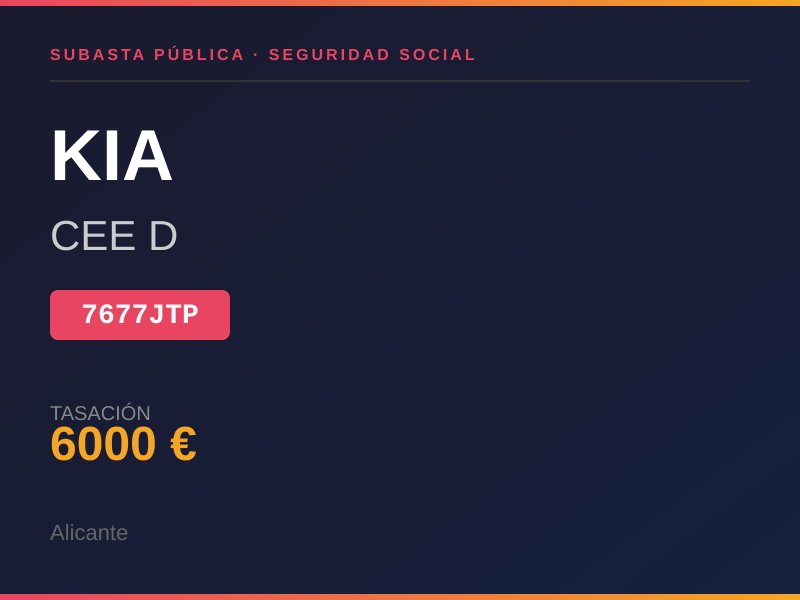 MATRICULACION: 31-10-2016 ESTADO VEHICULO: BUENO ESTADO MOTOR : DESCONOCIDO COMBUSTIBLE: GASOLINA KM.: DESCONOCIDO BATERIA: DESCONOCIDO RUEDAS: MEDIO CHAPA: ROCES DE USO. Lugar de subasta: CL MAYOR 3 ALICANTE/ALACANT