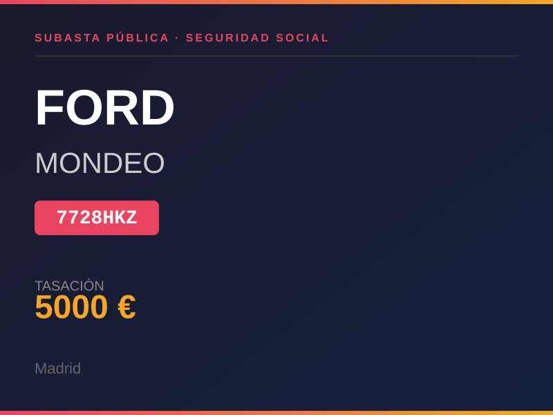 TURISMO DE COLOR BLANCO PEQUEÑOS GOLPES Y ROCES POR DISTINTAS PARTES DE LA CARROCERIA RUEDA DELANTERA DERECHA DE REPUESTO LLAVE: NO DOCUMENTACION: NO KM: NO. Lugar de subasta: CL AGUSTIN DE FOXA 28 30 MADRID