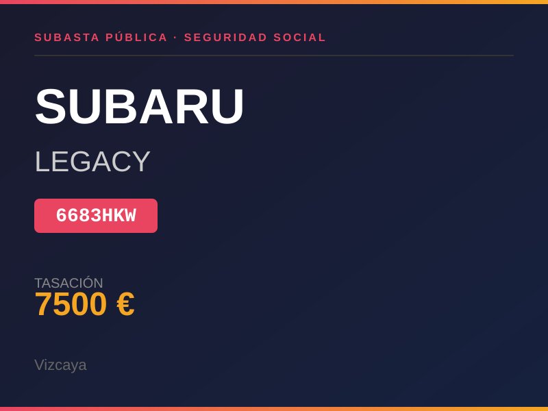 DEUDOR: RUIZ TEJADA, ARKAITZ NUMERO DE LOTE: ÚNICO SEGUNDA SUBASTA DE BIEN: TURISMO MARCA: SUBARU MODELO: LEGACY MATRICULA: 6683HKW VALOR TASACION: 7.500,00 CARGAS: CANCELACION REGISTRAL DE LA ANOTACION PREVENTIVA DE EMBARGO OBRANTE ALFOLIO 1 DEL BIEN Nº 20250001054 DEL REGISTRO DE BIENES MUEBLES DE BIZKAIA, PRORROGADA EN CUMPLIMIENTO Y EN LOS TERMINOS DE LA SENTENCIA DEL PLENO DE LA SALA1ª DEL TRIBUNAL SUPREMO Nº237/2021 DE 04 DE MAYO, A FAVOR DE LA TGSS, QUE SE -EJECUTA. LOS BIENES PODRÁN SER EXAMINADOS POR AQUELLOS A QUIENES INTERESEN, EN EL ALMA-CEN DE DEPOSITOS DE LA DIRECCION PROVINCIAL DE BIZKAIA, DE LA TESORERIA GENE--RAL DE LA SEGURIDAD SOCIAL, SITO EN POLÍGONO MARTIARTU I, CALLE 3, PUERTAS 44 A 49 (48480 ARRIGORRIAGA) EN HORARIO DE 9:00 A 15:00 DE LUNES A VIERNES.. Lugar de subasta: CL GRAN VIA 89 8º BILBAO