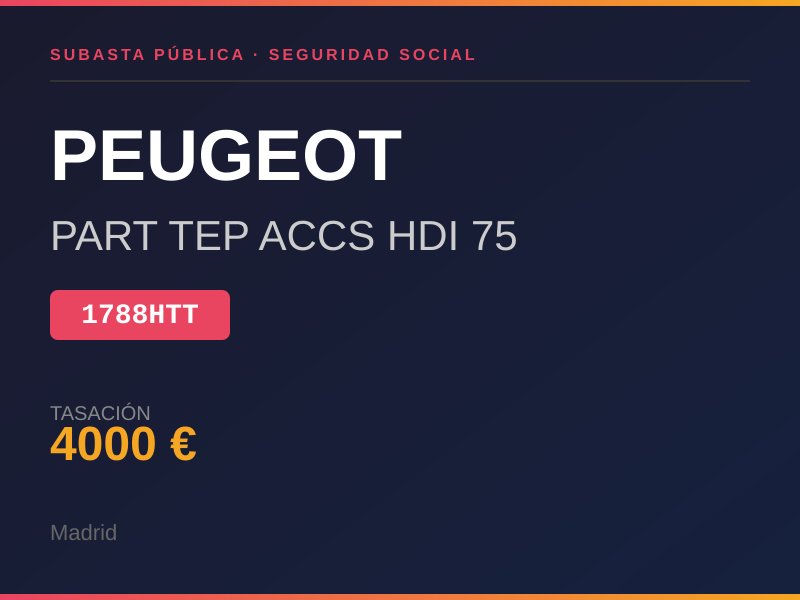 FURGONETA DE COLOR BLANCO MODELO PEUGEOT PARTNER HDI 75 PUERTA ABIERTA. LUNA DELANTERA ROTA, RETROVISORES COLGANDO, TIRADOR DE LA PUERTA LETERAL ROTO. GOLPES Y ARAÑAZOS POR DISTINTAS ZONAS DE LA CARROCERIA. NO TIENE LLAVE NI DOCUMENTACION. Lugar de subasta: CL AGUSTIN FE FOXA 28 30 MADRID