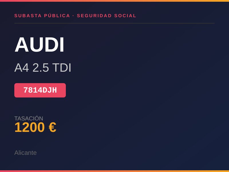 MATRICULACION: 1ª MAT. 17-10-2001 ESTADO VEHICULO: MEDIO MOTOR : DESCONOCIDO COMBUSTIBLE: DIESEL KM.: DESCONOCIDO BATERIA: DESCONOCIDO RUEDAS: MEDIO CHAPA: GOLPES Y ROCES DE USO. Lugar de subasta: CL MAYOR 3 ALICANTE/ALACANT