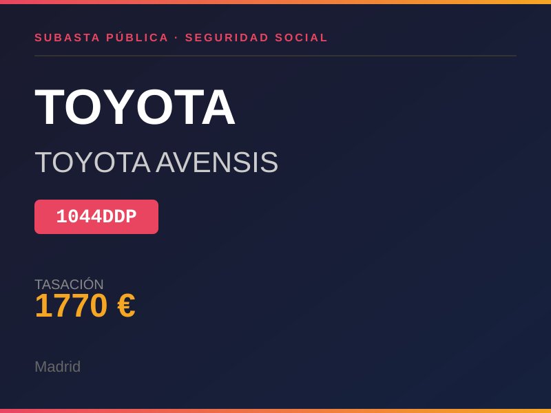 TURISMO DE COLOR NEGRO MODELO TOYOTA AVENSIS GASOLINA AUTOMATICO DETERIORO GENERAL DE LA CARROCERIA. TAPICERIA DE PIEL EN MAL ESTADO. NO TIENE LLAVES NO TIENE DOCUMENTACION. Lugar de subasta: CL AGUSTIN DE FOXA 28 30 MADRID