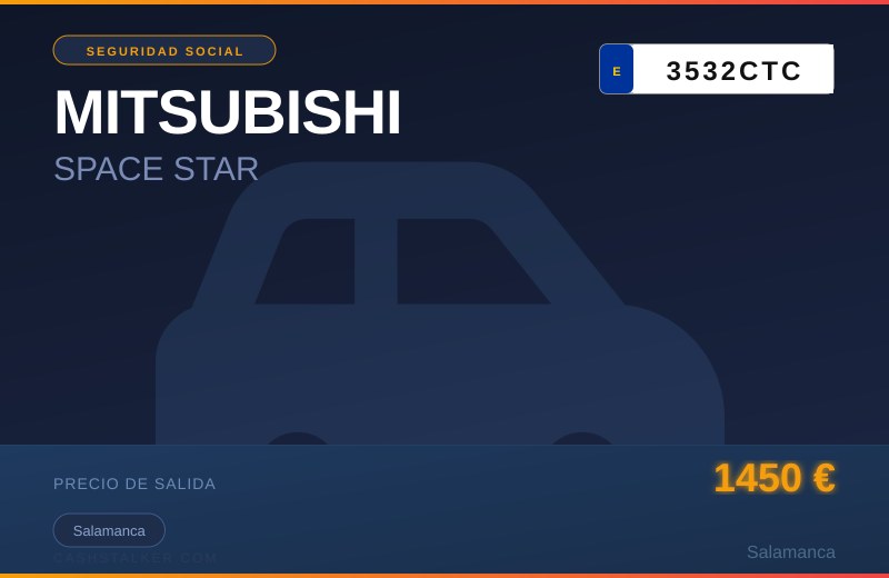 VEHICULO MARCA MITSUBISHI, MODELO SPACE STAR, MATRÍCULA: 3532CTC. FECHA DE MATRICULACION: 15 DE MARZO DE 2004. CARBURANTE. DIESEL. CILINDRADA: 1870 C.C. ITV VIGENTE. KMSULTIMA ITV:424.990KMPLAZAS NORMALES: 5. POTENCIA FISCAL: 13. NO SE DISPONE DE LAS LLAVES NI DE LA DOCUMENTACION DEL VEHICULO. SE ENCUENTRA DEPOSITADO EN ESTA DIRECCION PROVINCIAL. SE DESCONOCE LA EXISTENCIA DE TASAS O TRIBUTOS PENDIENTES DE PAGO. VEHÍCULO INSCRITO EN EL REGISTRO DE LA PROPIEDAD DE BIENES MUEBLES DE TOLEDO. - LA SUBASTA A REALIZAR ES SEGUNDA SUBASTA -. Lugar de subasta: PP CANALEJAS 129 1 SALAMANCA
