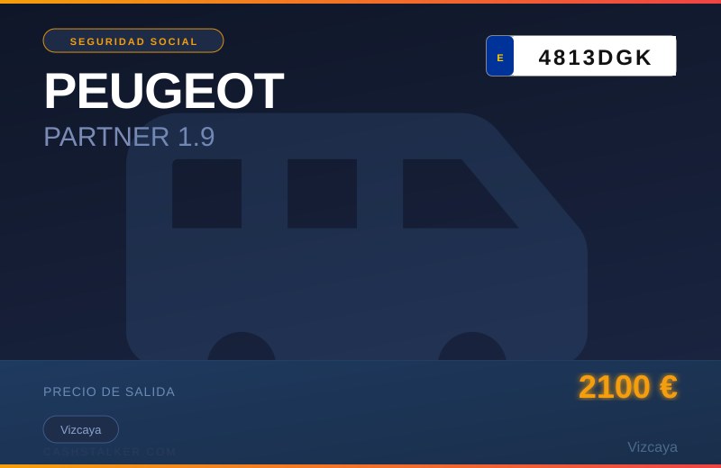SEGUNDA SUBASTA DEL BIEN: VEHÍCULO MIXTO ADAPTABLE MARCA: PEUGEOT MODELO: PARTNER 1.9 MATRÍCULA: 4813DGK VALOR TASACIÓN: 2100,00 CARGAS: - CANCELACIÓN REGISTRAL DE LA ANOTACIÓN PREVENTIVA DE EMBARGO OBRANTE AL FOLIO 1 DEL BIEN Nº 20230007490 DEL REGISTRO DE BIENES MUEBLES DE BIZKAIA, PRORROGADA EN CUMPLIMIENTO Y EN LOS TÉRMINOS DE LA SENTENCIA DEL PLENO DE LA SALA 1ª DEL TRIBUNAL SUPREMO Nº 237/2021 DE 4 DE MAYO, A FAVOR DE LA TESORERÍAGENERAL DE LA SEGURIDAD SOCIAL, QUE SE EJECUTA Y PRECINTO. LOS BIENES PODRÁN SER EXAMINADOS POR AQUELLOS A QUIENES INTERESEN, EN EL ALMA-CÉN DE DEPÓSITOS DE LA DIRECCIÓN PROVINCIAL DE BIZKAIA DE LA TESORERÍA GENERALDE LA SEGURIDAD SOCIAL, SITO EN POLÍGONO MARTIARTU I, CALLE 3, PUERTAS 44 A 49 (48480 - ARRIGORRIAGA), EN HORARIO DE 9:00 A 15:00 DE LUNES A VIERNES. CARGA PREFERENTE: 0,00 VALOR BIEN: 2100,00 VALOR LOTE: 2100,00 TIPO LICITACIÓN: 2100,00. Lugar de subasta: CL GRAN VÍA 89 8º BILBAO
