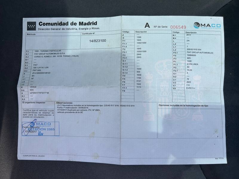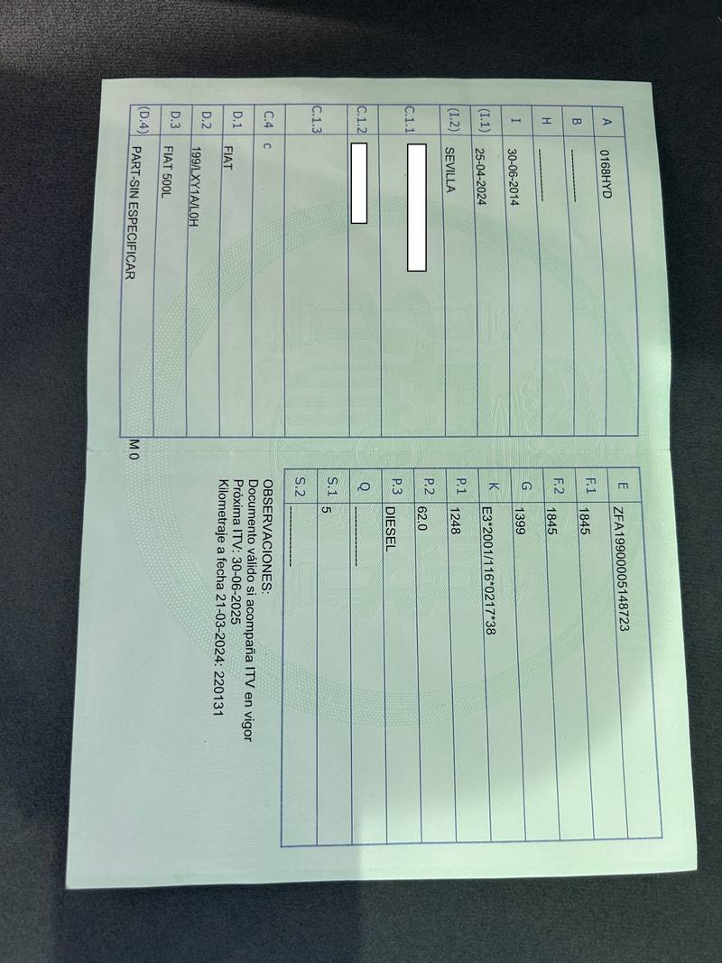 TURISMO NACIONAL/IMPORTACION FIAT FIAT 500L, matrícula 0168HYD (12 años), 5 plazas, Motor diesel 1248 cc, Uso: particular, Bastidor ZFA19900005148723.