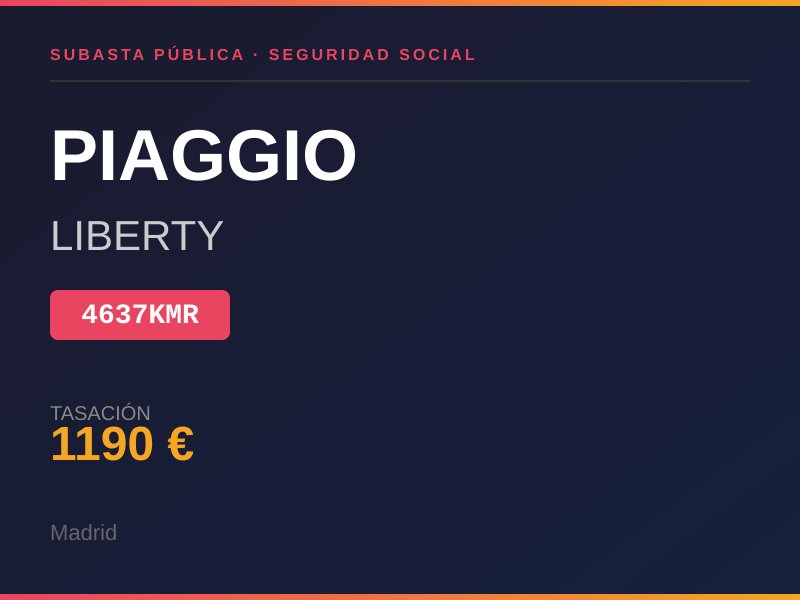 SCOOTER DE COLOR BLANCO MODELO PIAGGIO LIBERTY 125 ASIENTO EN MAL ESTADO. LA APRIENCIA DEL RESTO ES BUENA. NO TIENE LLAVES NI DOCUMENTACION.. Lugar de subasta: CL AGUSTIN DE FOXA 28 30 MADRID