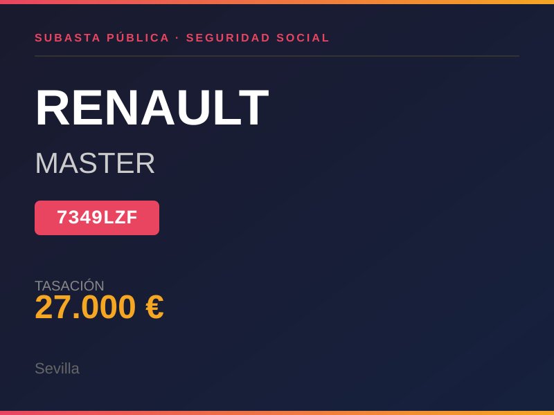 FURGONETA MARCA RENAULT MODELO MASTER, MATRICULA 7349LZF FECHA DE MATRICULACION 14/07/2022 BASTIDOR VF1MA000369268171 VEHICULO CON LLAVES Y DOCUMENTACION KILOMETRO 72943 OBSERVACIONES: BUEN ESTADO GENERAL, DESPERFECTO EN LA LUNA DELANTERA DEPOSITO: NAVE DE LA TGSS EN PG. EL PINO CALLE PINO ESTROBO, 22, SEVILLA TELEFONO DE CONTACTO PARA CITA PREVIA 954592613. Lugar de subasta: CL PABLO PICASSO 8 3 SEVILLA
